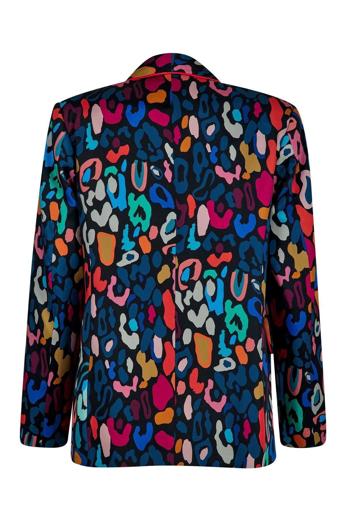 Dive into a world of color with this vibrant printed jacket, a bold statement piece that doesn't shy away from expressing individuality. Its playful yet sophisticated pattern of abstract shapes in a kaleidoscope of blues, reds, and neutral tones, framed by a classic navy trim, makes it a standout garment for any wardrobe. The design is complemented by a relaxed fit and traditional notched lapels, which lend an air of casual elegance. The lightweight fabric ensures it's comfortable enough for all-day wear, while the eye-catching print can dress up a simple outfit or make a stylish ensemble pop. Perfect for those who want to infuse their look with personality and fun, this jacket is as versatile as it is fashionable.